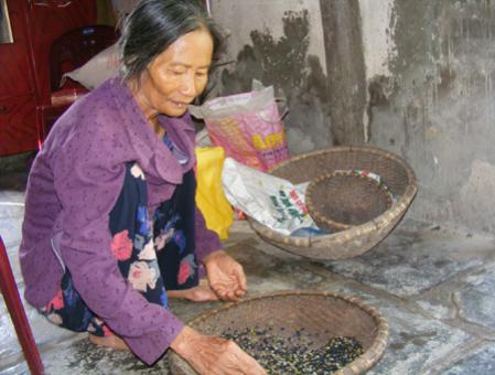 Bà Duân nhặt những hạt đậu để ủ giá bán kiếm tiền mua thuốc, ăn uống hằng ngày nhưng chỉ là như muối bỏ biển.