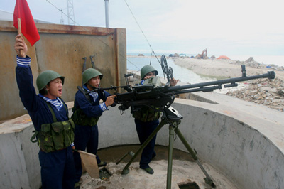 Lính Việt Nam tập dượt với súng 12.7mm tại đảo Phan Vinh, thuộc quần đảo Trường Sa của Việt Nam. Giới lãnh đạo Việt Nam hiện đang ngả theo xu hướng đàm phán song phương với Trung Quốc về các vấn đề Biển Ðông. (Hình: Vietnam News Agency/AFP/Getty Images)