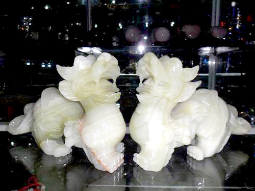 Theo lời giới thiệu của người bán hàng thì tỳ hưu là mặt hàng được nhiều đại gia ưa dùng để cải thiện phong thủy của các phòng VIP. Những con tỳ hưu được làm từ đá và ngọc, có 3 cấp bậc là hàng chuẩn, hàng trung và hàng khủng với 3 màu đen, xanh, trắng tượng trưng cho tài lộc, công danh và sức khỏe.
