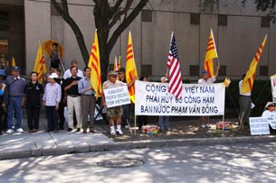 Có người từ tiểu bang Florida. Có người từ Na Uy và có người đến từ Úc. Nhưng cái đặc biệt của cuộc biểu t́nh ngày 14 tháng 9 năm nay trước ṭa Tổng lănh sự Việt Nam tại Houston là có khoảng 8 người ngồi trước tấm biểu ngữ, viết: "Đả đảo CSVN-Phạm văn Đồng kư công hàm 14/9/1958 Dâng Biển, Đảo cho Trung Cộng" với ư định sẽ tọa kháng 8 giờ đồng hồ để phản đối nhà nước Việt Nam.