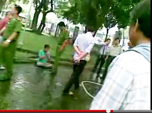 Cảnh sát Việt Nam đang bắt các học viên Pháp Luân Công tại công viên Lê Văn Tám/TPHCM vào ngày 9 tháng 10, 2011. Source video của VietSOH.net.