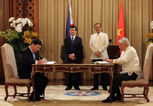 CT Trương Tấn Sang (trái) và TT Philippines Benigno Aquino đứng trong lúc BT NG Phạm Bình Minh (trái)đang ký kết thỏa thuận song phương trong một buổi lễ tại Palace Malacanang ở Manila hôm 26 tháng 10 năm 2011./AFP photo/Ho/Jay Morales/MPB