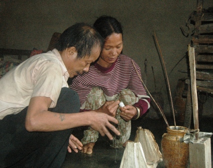 | Vợ chồng ông Nia “biểu diễn” cách chữa bệnh gia truyền. |