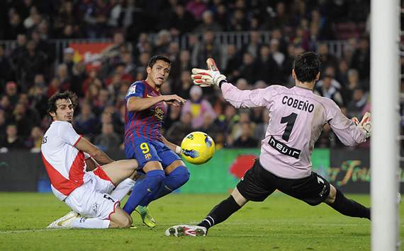 Chơi không thực sự nổi trội nhưng đẳng cấp đã giúp Barcelona có bàn thắng vươn lên dẫn trước. Phút thứ 29', Alexis Sanchez tỏa sáng với một pha xử lí tuyệt vời: có bóng bên cánh trái từ đường kiến tạo của Xavi rồi loại bỏ một hậu vệ Vallecano trước khi dứt điểm kỹ thuật vào góc xa, đưa bóng dội cột dọc trước khi làm tung lưới thủ thành Cobeno. 1-0 cho Barcelona!