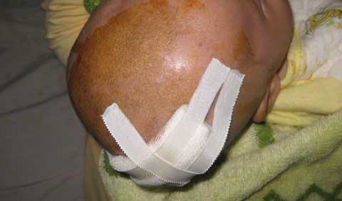 Bé trai 2 tháng tuổi bị bóp lún sọ não?