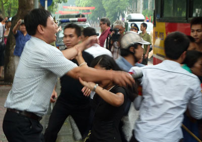 Mật vụ đang lùa bắt người biểu tình chống Trung quốc bá quyền ở Hà Nội lên xe buýt ngày 21 tháng 8, 2011. (Hình: IAN TIMBERLAKE/AFP/Getty Images)