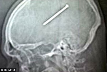 Vô tình tự bắn đinh dài 9cm vào đầu mà không hay biết