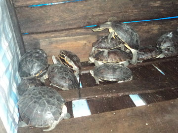Đă có của lại c̣n phải cố công giữ, ông Hoàng tâm sự: “Quân săn bắt rùa dạo này biết nhà tôi có nhiều rùa nên thường đi ngang đi ngửa ḍm ngó, tôi sợ chúng nó bắt trộm nên buổi tối phải ôm rùa vào tận trong buồng ngủ rồi ngồi canh giữ suốt đêm”. Bữa khách đến thăm nhà, đàn rùa vẫn “án binh bất động” trong pḥng. Đưa chúng tôi vào xem đàn rùa, ông Hoàng phải dùng đèn pin bật sáng rồi chỉ cho khách xem từng con.