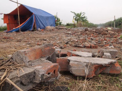 Người nhà ông Đoàn Văn Vươn phải dựng lều ở tạm bên cạnh khu nhà cũ của họ đã bị san bằng
