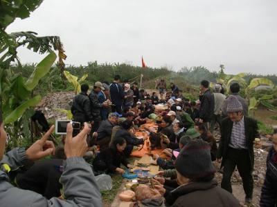 Khoảng 200 nông dân bị nhà cầm quyền cướp đất ở huyện Văn Giang, Hưng Yên và Dương Nội, Hà Ðông (Hà Nội) tới thăm gia đình ông Vươn, ông Quý. Họ bày bữa ăn ngay chỗ căn nhà bị phá để cùng ăn và chia sẻ với gia chủ. (Hình Blog Nguyễn Quang Vinh)