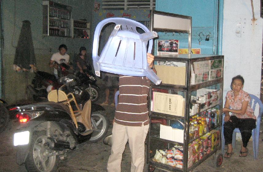 ở Việtnam khẩu trang che mặt bán khắp mọi nơi, làm gì phải dùng ghế để che mặt . chắc thằng công an này muốn ngữi cái mùi đít cứt của khách hàng ngồi trên chiếc ghế đó thôi..........