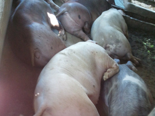 T. đưa chúng tôi đến một trại heo tư nhân ở Gia Kiệm (huyện Thống Nhất), nơi có hàng trăm con heo lớn nhỏ và có 30 con chuẩn bị đến ngày xuất chuồng. Trại heo khá rộng, hai công nhân đang tất bật với công việc tắm heo và bê những thùng cám ăn thẳng cho heo đổ vào máng tự động. Trại heo được chia ra nhiều chuồng nhỏ. Mỗi chuồng có khoảng 30 con, lớn nhất khoảng 1 tạ, nhỏ khoảng 20 kg. Ông chủ nuôi heo tên H. dẫn chúng tôi ra xem bầy heo 30 con. Bầy heo nhìn khá bắt mắt, con nào con nấy mông vai căng tròn, mũm mĩm đang nằm ngủ li bì dưới nền chuồng còn vương vãi những hạt cám heo ăn thẳng.