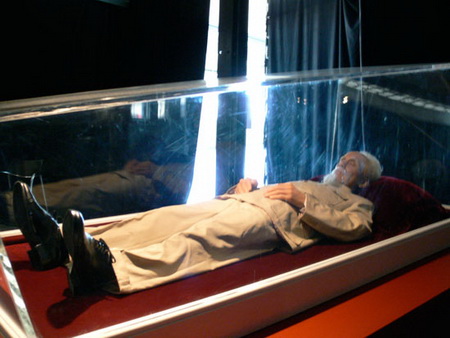 Lenin, Mao Trạch Đông, Kim Nhật Thành, Hồ Chí Minh, Fidel Castro – điều ǵ đă kết hợp tất cả những con người này. Mỗi nhân vật đều có vị trí trong sách giáo khoa của các chế độ cộng sản, và mỗi người trong số họ đều là đối tượng của sự sùng bái được khuếch trương bởi bộ máy tuyên truyền vượt ra ngoài cả ranh giới của đời sống và cái chết. Mỗi người trong số họ cũng trở thành một vị anh hùng… của bức ghép nghệ thuật có tên “Cuộc hội nghị thượng đỉnh” (Summit) của nghệ sĩ Trung Quốc Shen Shaomin. Tuy nhiên, hội nghị thượng đỉnh này khá đặc biệt – bởi v́ theo t́nh trạng hiện thời, người c̣n sống sót duy nhất của “tập hợp” là Fidel Castro (chứng minh bằng lồng ngực của ông ta được phồng lên vừa phải). Những người c̣n lại, với khoảng cách gần nhau, nằm trong những chiếc quan tài bằng kính trong suốt để bảo vệ chúng trước đám đông ṭ ṃ. Cũng như trong thực tế, sau khi chết thi hài của bốn trong số các nhà lănh đạo cộng sản trên đă được đặt trong các lăng mộ xây dựng đặc biệt để vinh danh họ trước công chúng nhằm thu hút chú ư. Sự sùng bái họ sau khi chết vẫn được sử dụng như công cụ cho mục đích chính trị mà gần đây nhất chúng ta đă nhận thấy trong tang lễ của Kim Jong Il.