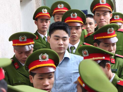 Lê Văn Luyện tỏ ra không sợ hăi khi bị dẫn giải tới phiên ṭa sơ thẩm - Ảnh: Nguyễn Quyết