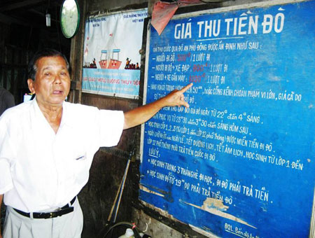 Ông Tám Ḥa chỉ vào bảng giá phà hơn chục năm không thay đổi.