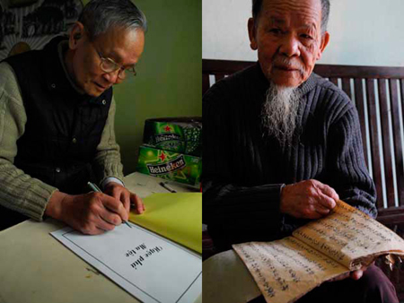 Ông tộc trưởng Ma Ngọc Bảo với gia phả dòng họ (trái) và cụ Từ, người trông coi ngôi đền Trù Mật, đang giữ những tư liệu liên quan đến dòng họ Ma.
