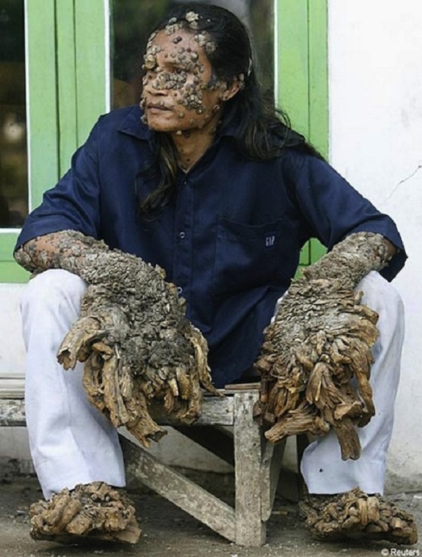 Đây là một căn bệnh gây ra bởi tác động của một căn bệnh khác HPV - căn bệnh nhiễm trùng cực nặng. 80% chúng ta đều mắc bệnh nhiễm trùng song nó không biểu hiện ra ngoài. Một khi mắc phải hội chứng người cây này, trên cơ thể sẽ xuất hiện rất nhiều tổn thương, chúng lớn lên không ngừng với tốc độ chóng mặt, đặc biệt ở bàn tay, bàn chân hay mặt, khiến người bệnh trông như thể “nửa người nửa cây”. Hình ảnh các bạn nhìn thấy là anh Dede Koswara, ở đảo Java, Indonesia, Dede đã phải chịu sống chung với căn bệnh quái ác khi cơ thể anh bị bao phủ bởi những bướu cây, đặc biệt là đôi bàn tay bàn chân phát triển như các rễ cây sần sùi gớm guốc. Trải qua 4 cuộc phẫu thuật quan trọng để loại bỏ 1,8kg “rễ cây” khỏi tay và chân, hiện tại anh đã có thể cử động ngón tay tốt hơn, tự bấm các phím số trên điện thoại và nói chuyện với bạn bè.