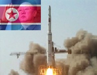 Chân dung dung cố Chủ tịch Kim Jong-il bên cạnh h́nh ảnh tên lửa Unha-3 của Triều Tiên.