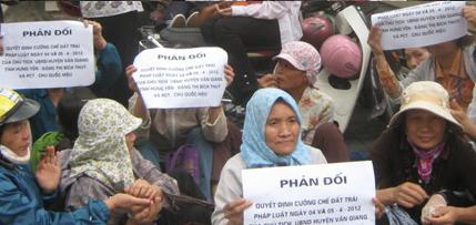 Nông dân Văn Giang mang theo nhiều khẩu hiệu và thậm chí cả bang rôn đến cuộc tập trung ngày hôm nay. Nội dung các khẩu hiệu và bang rôn ghi rơ phản đối quyết định cưỡng chế đất trái pháp luật ngày 4 và 5 tháng 4 năm 2012 của chủ tịch và phó chủ tịch ủy ban nhân dân huyện Văn Giang, tỉnh Hưng Yên.