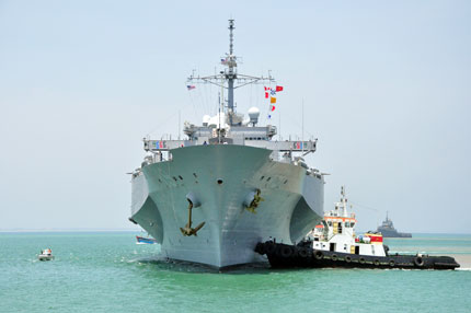 | Sau hơn 30 phút lai dắt, tàu tiên phong USS Blue Ridge (LCC-19) cũng được lai dắt, cập cảng Đà Nẵng thành công |