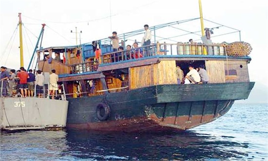 Một tàu hải quân Philippines và tàu cá Trung Quốc. Ảnh: AFP