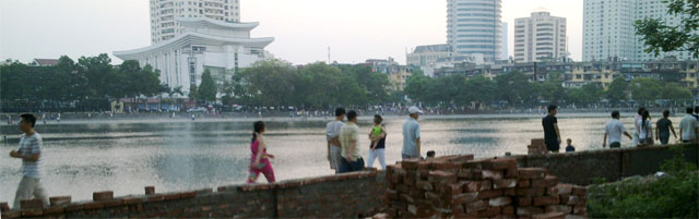 Mới đây nữa, góc phía Bắc của hồ là dự án văn pḥng cho thuê to tướng của BRG, tập đoàn kinh doanh sân golf và BĐS rất lớn của bà Nguyễn Thị Nga. Khi xây xong, chắc chắn khu nhà này sẽ án ngữ toàn bộ hướng Bắc của hồ. Điều đáng nói là cách đây khoảng 2 tuần, hàng rào của dự án bỗng được “di chuyển” lấn vào đất của hồ đến hơn 1m chiều rộng mà không hề có ai có ư kíên. Nếu tính mỗi mét vuông đất ở khu vực này có giá đến 500triệu đồng/m2 th́ sự lấn chiếm này mang lại cho bà Nga đến hàng chục tỷ đồng. Được biết bà Nga đă sở hữu đến 3 sân golf, khách sạn Hilton, hàng chục dự án BĐS vàng ở khắp nơi miền Bắc. Hàng chục tỷ đồng từ mấy chục mét đất lấn chiếm này chỉ là “muỗi” so với khối tài sản khổng lồ của bà nhưng với cảnh quan của hồ th́ mấy chục mét đất này vô cùng quí báu.