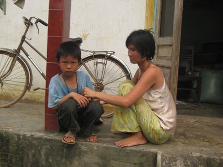 Chị Lê Thị Thái – mẹ của Giai, nhìn chúng tôi với ánh mắt dài dại của người đàn bà đã 8 năm bị căn bệnh điên hành hạ. Nhìn thấy Giai ánh mắt người đàn bà chợt dịu lại đôi chút. “Giai mặc ai mà xấu vậy con”, chị đưa tay vẫn đứa con về phía mình. Trái với hình ảnh thường thấy, cậu bé Giai cứ nép sau thầy hiệu trưởng, sợ sệt nhìn mẹ.