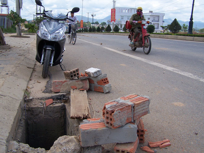 Chứng kiến những vụ tai nạn đă xảy ra, người dân gần đó dùng gạch đá, gỗ... làm bờ rào che chắn quanh hố sâu nhằm cảnh báo cho người đi đường biết để tránh bị sụp hố... Ông Phan Đ́nh Việt - giám đốc Công ty Môi trường đô thị Kon Tum - nói đây là đường Hồ Chí Minh đoạn đi qua TP Kon Tum vừa mới xây dựng và đưa vào sử dụng, c̣n trong thời gian bảo hành nên chưa bàn giao cho công ty quản lư.