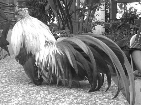 Có con gà trống cao chừng 20cm nhưng bộ lông đuôi rực rỡ vươn lên cao tới 35cm, rồi phủ xuống tha thướt. Lại có con khác lông đuôi cũng bình thường, nhưng hai cánh lại như vạt áo dài che hết cả chân, nhìn từ đằng sau thật bệ vệ, giống người chắp hai tay sau lưng đi dạo, trông rất buồn cười. Khi đến trước mấy cái lồng nuôi con mái, chú gà trống đột ngột xoay người, xòe cánh và “múa” như chim công. “Múa” xong thì gáy rất hãnh diện.