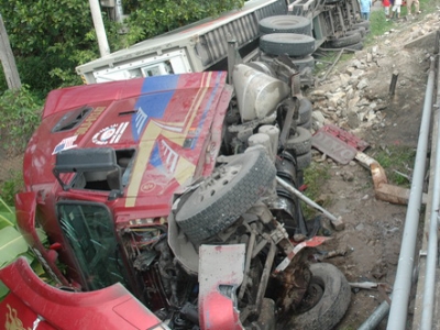 Tài xế ngủ gục, xe container bay qua lan can cầu