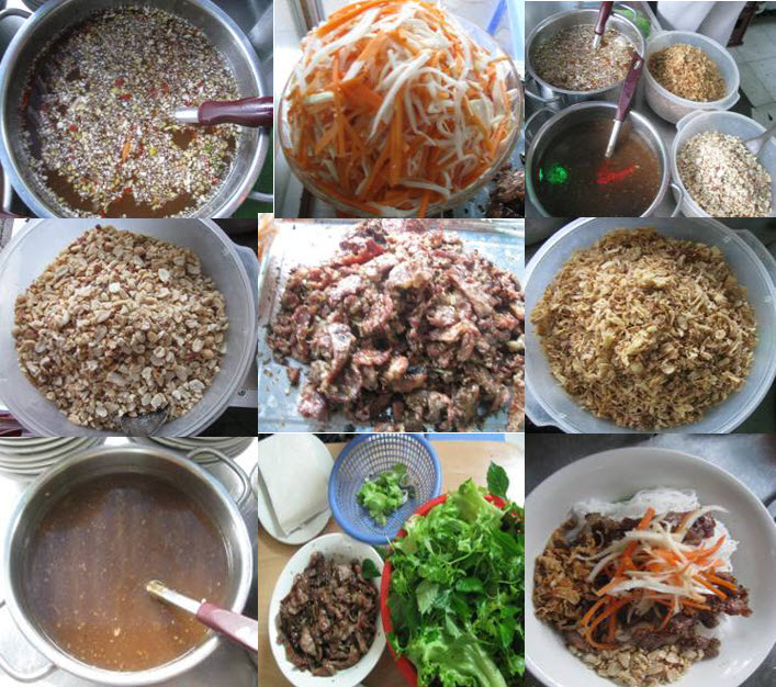 Công việc cho một ngày bắt đầu từ sáng sớm. Là người kỹ tính nên bà chủ chuẩn bị nguyên liệu rất cẩn thận: rau sống, hành tỏi mua ở chợ Long Biên, bánh ướt đặt ở nơi làm bánh phở Ngũ Xã, thịt lợn nhập của người quen ở Vĩnh Phúc, chưa kể gia vị Huế (mắm ruốc Huế, mắm ngon, gia vị khô…) được chủ quán đích thân đặt ở Huế mang ra mỗi tháng một lần.