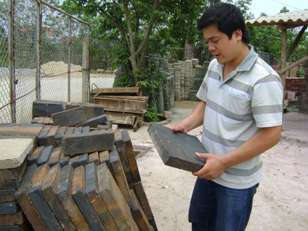 Anh gom tất cả các thứ “bỏ đi” như xỉ than ḷ gốm ở các xă Bát Tràng, Kim Lan... rồi nhào nặn thành những viên gạch “siêu nhẹ”, bền, đẹp, giá cả phải chăng.