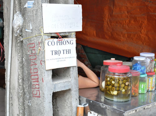Quanh ĐH Công nghiệp Hà Nội, Bách khoa, Thương mại, Đại học Quốc gia Hà Nội... những ngày qua, nhan nhản các tấm biển cho thuê nhà trọ ngắn ngày với mức giá 100 ngàn/người/ngày (ở ghép phòng 6 người), hoặc 2 triệu/phòng/3 ngày thi.