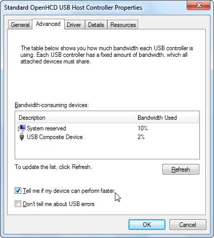 Đầu tiên, hăy chắc chắn rằng thiết bị thực sự có thể đạt tốc độ dữ liệu nhanh hơn hay không. Chẳng hạn như, nếu ta sử dụng một ổ USB 1.1 đời cũ cắm vào cổng USB 2.0 th́ Windows sẽ hiển thị thông tin cảnh báo trên. Cảnh báo này không nhất thiết để chỉ thị rằng bản thân thiết bị có thể cho phép tốc độ nhanh hơn nữa mà chỉ là chính cổng USB đang hỗ trợ tốc độ chậm hơn tốc độ dữ liệu của thiết bị.
