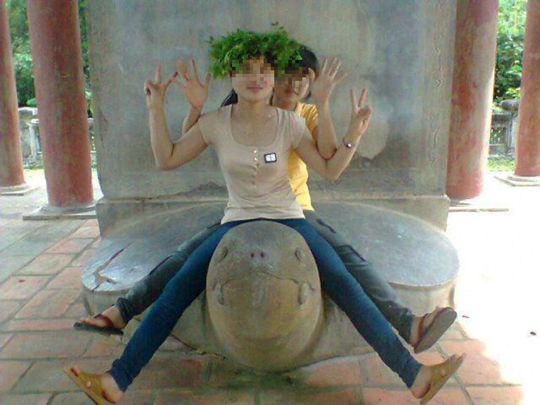 Bức xúc cảnh hai cô gái cưỡi cổ Rùa Văn Miếu