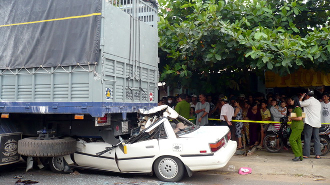 Ôtô nát đầu dưới gầm xe tải, 2 người tử vong
