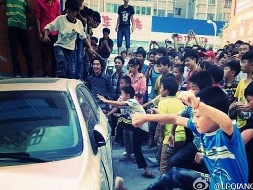 Người Trung Quốc dạy trẻ em cách đập phá xe hơi Nhật. Ảnh: Weibo