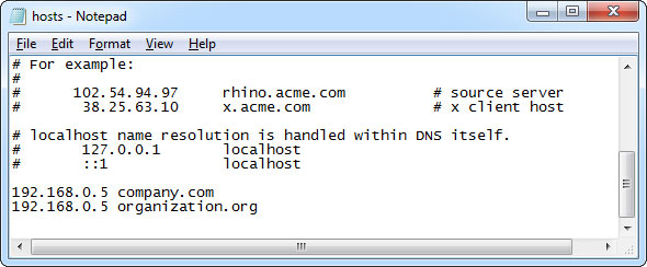Ví dụ như, nếu có một web server với địa chỉ IP cục bộ 192.168.0.5 dùng cho cả company.com và organization.org, bổ sung ḍng sau đây vào file hosts trên máy tính: