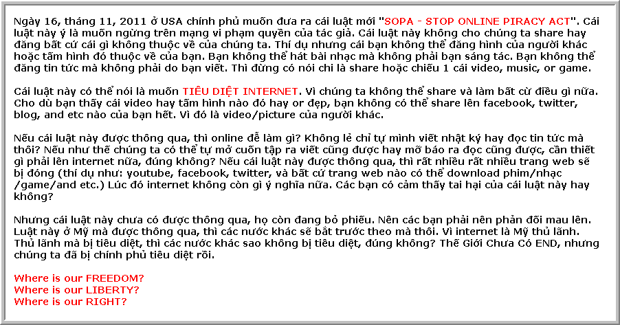 Cái "NDAA - National Defense Authorization Act" đă thành luật và ông Obama đă kư từ đầu năm nay rồi. Ḿnh không có nói xạo ok. Các bạn không tin th́ lên YOUTUBE hoặc GOOGLE search "NDAA - National Defense Authorization Act" này đi ok.