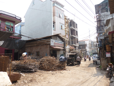 Vào một nhà có đống vỏ lon chất kín một khoảng sân rộng và ḷ cũng đang đỏ lửa. Khi đó những công nhân làm thuê đang múc từng gáo nhôm nung chảy trong ḷ đổ vào khuôn. Thi thoảng họ lại đảo ra sân hóng gió. Tôi hỏi chuyện anh Điền, một người làm thuê đến từ làng Trác Bút, thị trấn Chờ (Yên Phong).