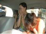 "Tú bà" Phú (ngồi giữa) cùng 2 gái bán dâm bị đưa lên xe về trụ sở công an.