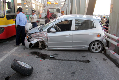 Xe con “cắn” đuôi xe buýt trên cầu Chương Dương