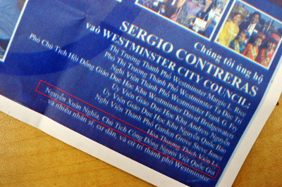 Flyer vận động tranh cử của ứng cử viên Sergio Contreras gởi về nhà cử tri gốc Việt có ghi “Nguyễn Xuân Nghĩa, Chủ Tịch Cộng Ðồng Người Việt Quốc Gia” trong danh sách những người chính thức ủng hộ ông. (Hình: Dân Huỳnh/Người Việt)