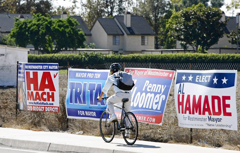 | Biển hiệu vận động tranh cử chức thị trưởng thành phố trên đường phố Westminster. Ảnh: Los Angeles Times |