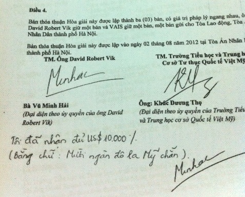 | Biên bản hòa giải về vụ ông Vik với trường Việt Mỹ và bút tích luật sư Hải nhận đủ số tiền mà trường này trả cho ông Vik |