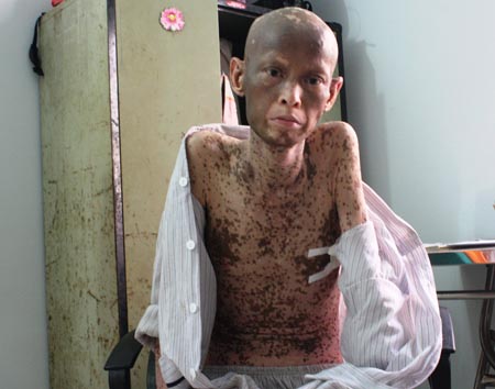 Nhưng khi về nhà được vài ngày thì anh lại sốt, da dị ứng đỏ và bắt đầu rạn nứt, trên cơ thể xuất hiện những vết đốm xám đen trên da. Gia đình tiếp tục đưa anh trở lại Bệnh viện Bệnh Nhiệt Đới để điều trị gần 3 tuần nhưng bệnh tình không thuyên giảm.