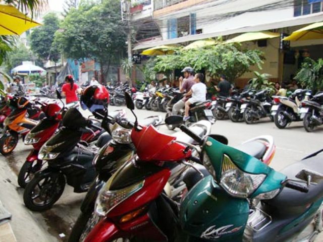 Xe máy đậu đầy hè phố, dân đi dưới ḷng đường