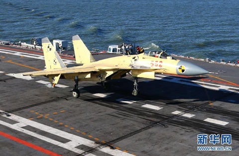 | | Phi cơ J-15 trên tàu sân bay Liêu Ninh - Ảnh: Tân Hoa Xã |