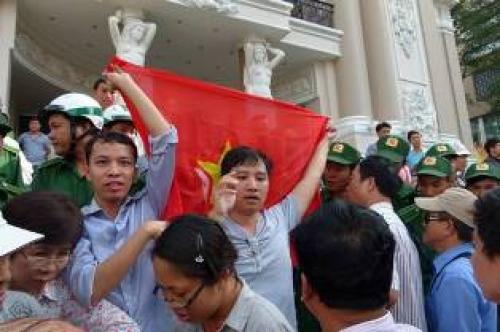 Khi mọi người còn túm tụm thành từng nhóm nhỏ trước Nhà hát lớn chờ hiệu lệnh châm ngòi cho cuộc biểu tình chống quân xâm lược Trung Quốc thì sớm hơn dự kiến, khoảng 8g40 phút, một thanh niên rút từ trong túi ra lá cờ Tổ quốc rồi hô lớn “Việt Nam”, “Việt Nam”.