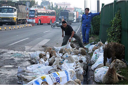 3 người kẹt trong ca bin xe tải, hàng chục con dê tràn xuống đường